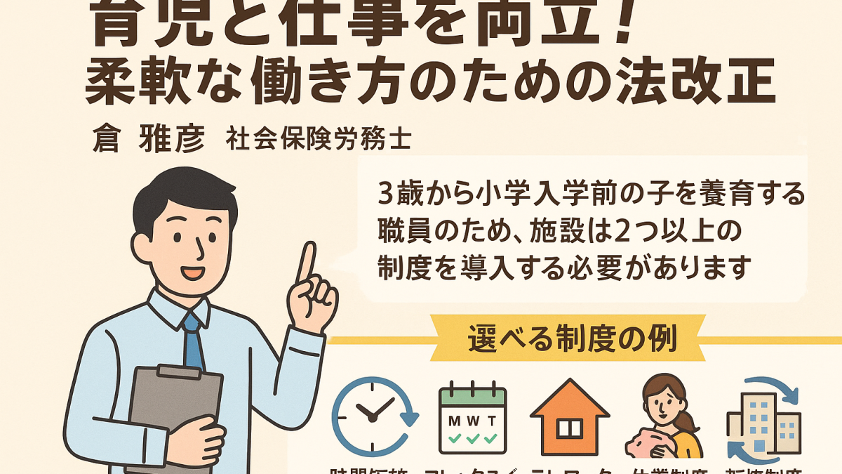 こんにちは、社会保険労務士の倉雅彦です。今回は、子育て世代の職員が「働き続けられる職場づくり」を進めるために重要な、柔軟な働き方に関する法改正についてご紹介します。総務担当者の皆さまにとっては、制度設計や職場周知の準備が求められる重要なテーマです。